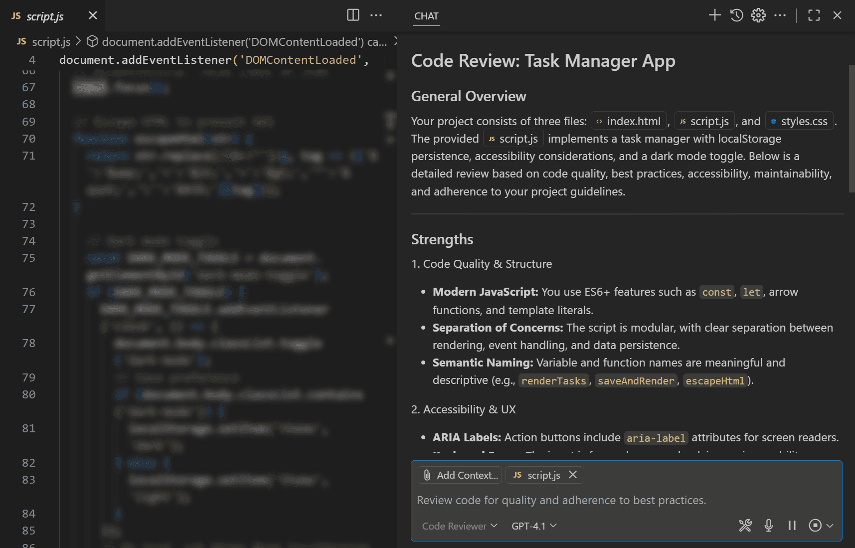Beyond simple autocompletion, Copilot offers an "agentic" or chat-based experience. You can ask it to write, explain, or fix code in plain English.